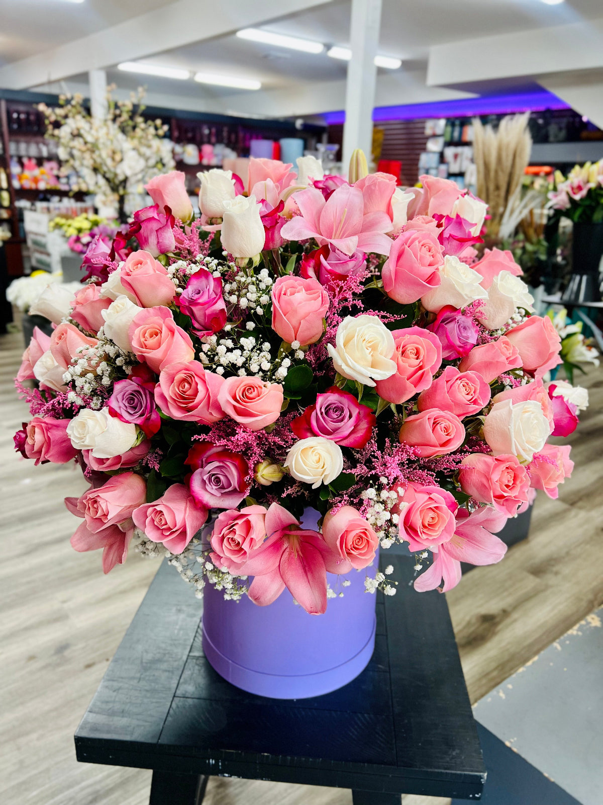 Our 100 Reasons To Love You blends the classic beauty of pastel color tones of roses in one arrangement, offering a stunning visual effect for any special occasion. Each rose is handpicked to ensure that you only receive the highest quality blooms.