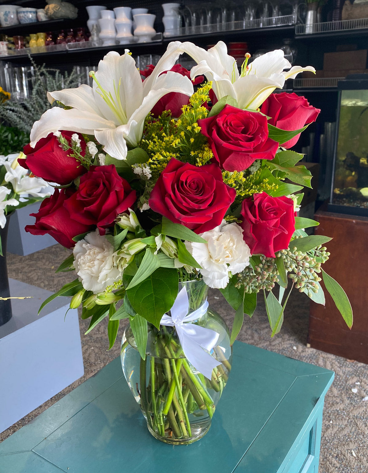Show your special someone you really care with the Classy Love! Fall in love with the vibrant combination of red roses and white flowers surrounded by lush foliage. Express your love with this elegant flower arrangement - it's sure to make a lasting impression!