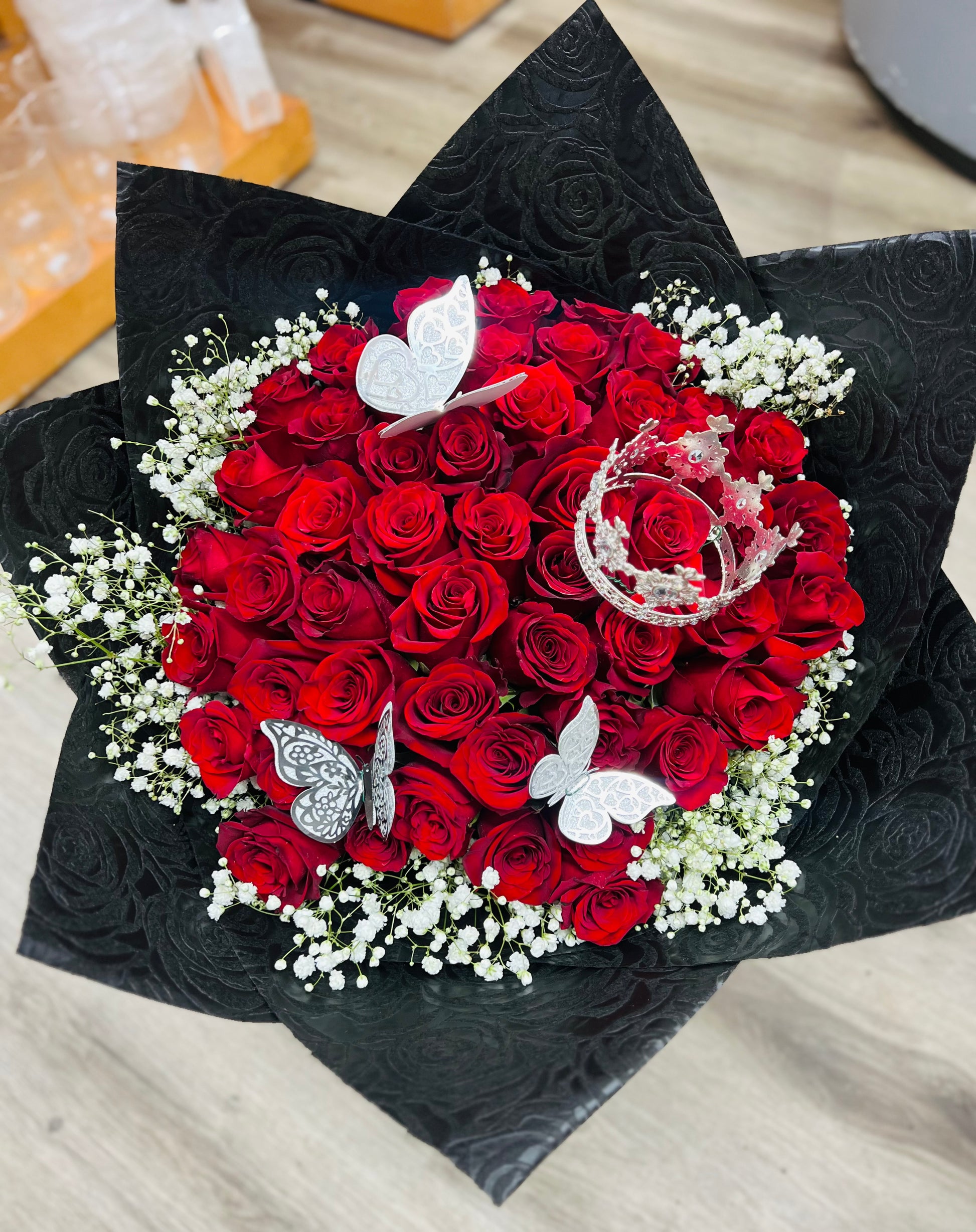 Get ready to fall head over heels with My Valentine's Buchon! This dazzling red rose delight, adorned with breezy baby's breath and fluttering butterflies, is fit for royalty with its charming crown. Perfect for turning hearts into mush—just like magic!
