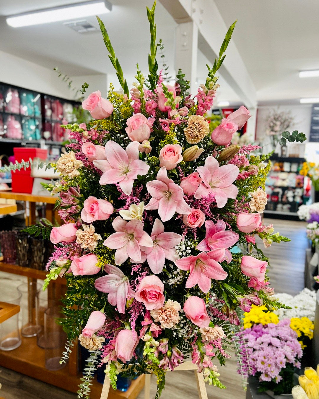 This elegant spray of flowers serves as a fitting tribute for a funeral. The carefully arranged blooms exude warmth and nostalgia, offering comfort in a time of mourning. Pay respects to a loved one with this heartfelt memorial spray.