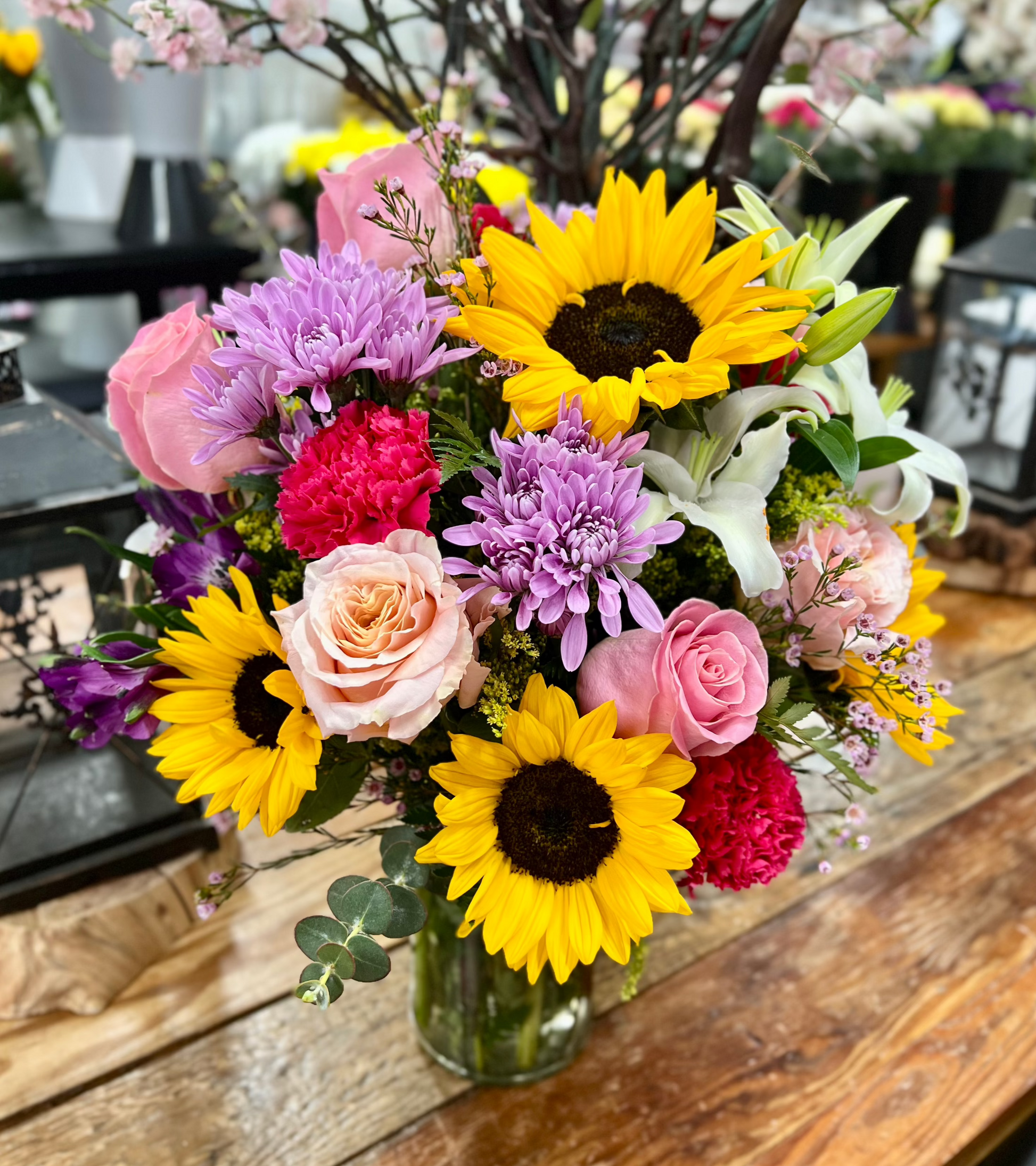 Smile in the sunshine with this beautiful mix of flowers! With vibrant colors and unique shapes, Sunshine Smile will add life and energy to any room. Light up your life with a splash of color!